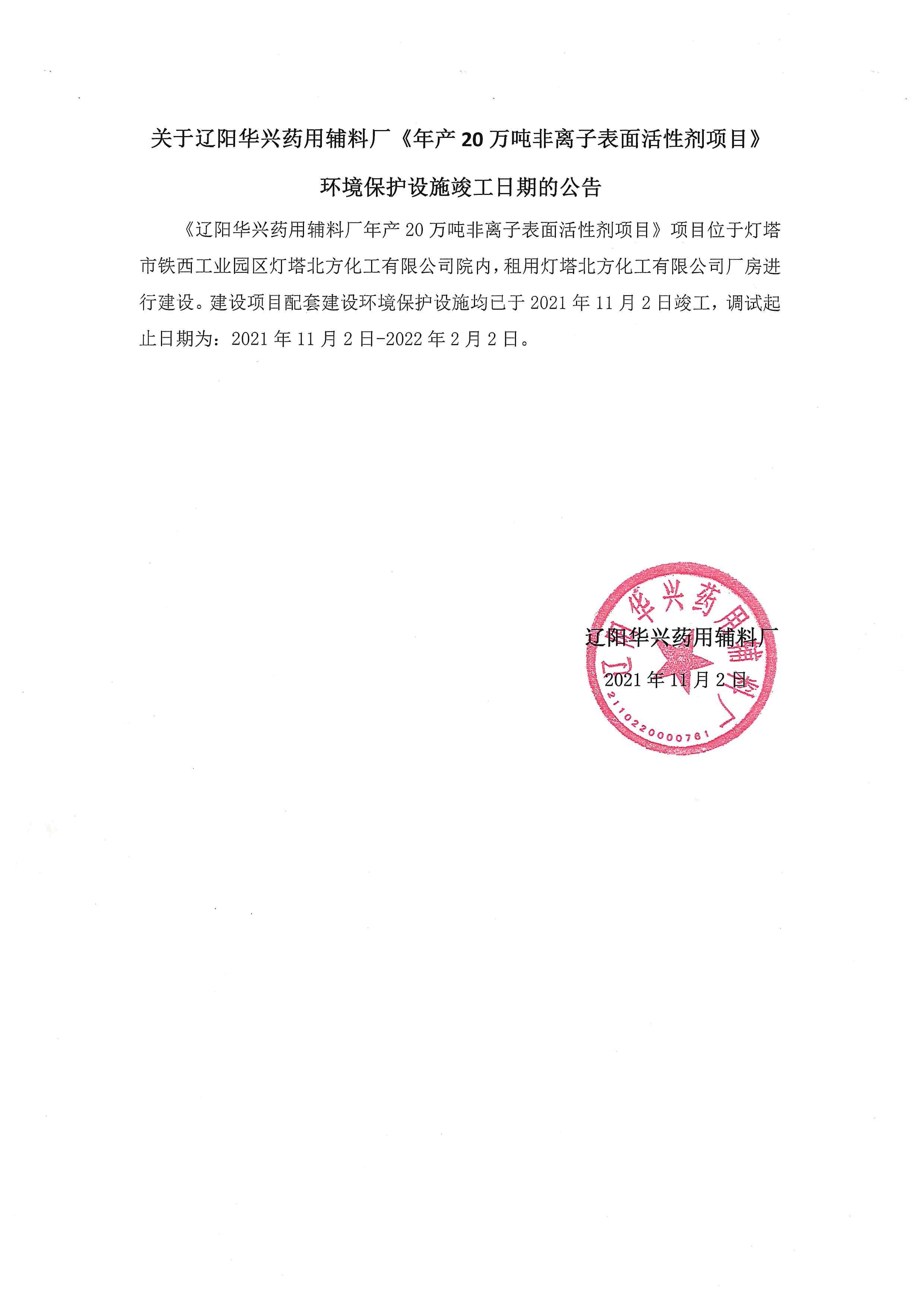 关于辽阳华兴药用辅料厂《年产20万吨非离子表面活性剂项目》环境保护设施竣工日期的公告